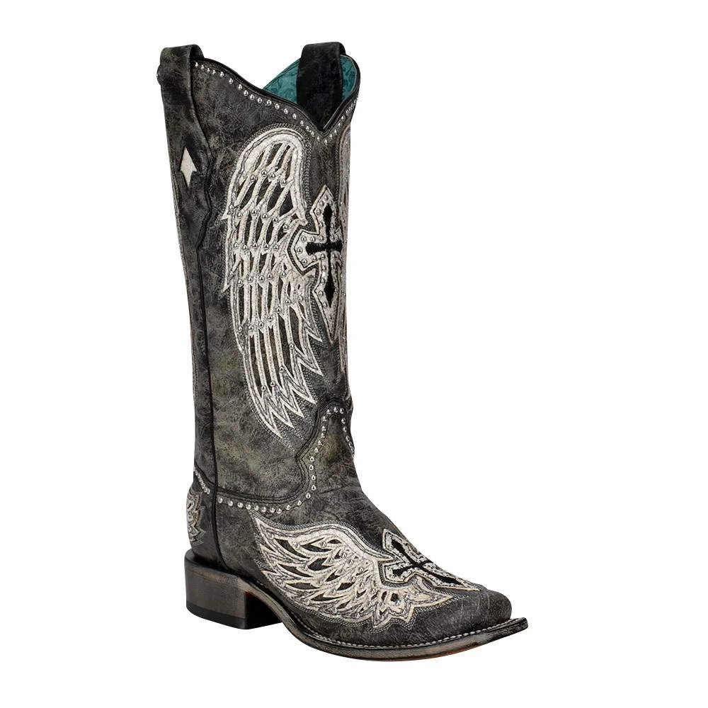 A wonderfully unique style for that cowgirl to match up with her jeans or dress. These Corral Womens Black Cross and Wing Embroidery with leather overlay, studs and crystals look fashionable while still being functional riding in the saddle, riding that motorcycle, wearing casually everyday or showing your horse in the arena.
