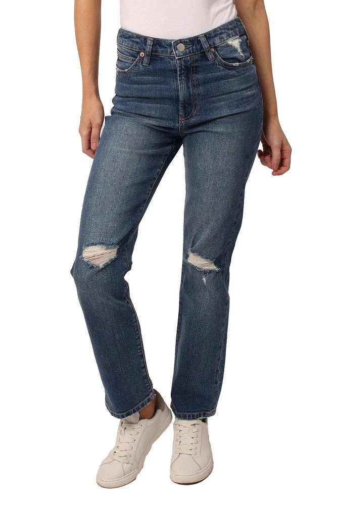 Super high rise ankle straight leg jeans. It’s the delightful fit that sits at natural waist and fits straight lean from hip to mid thigh. Ankle inseam on comfort stretch denim accented with random destructions & abrasions, hand sanding whiskers at hip, grindings at pocket & leg opening.