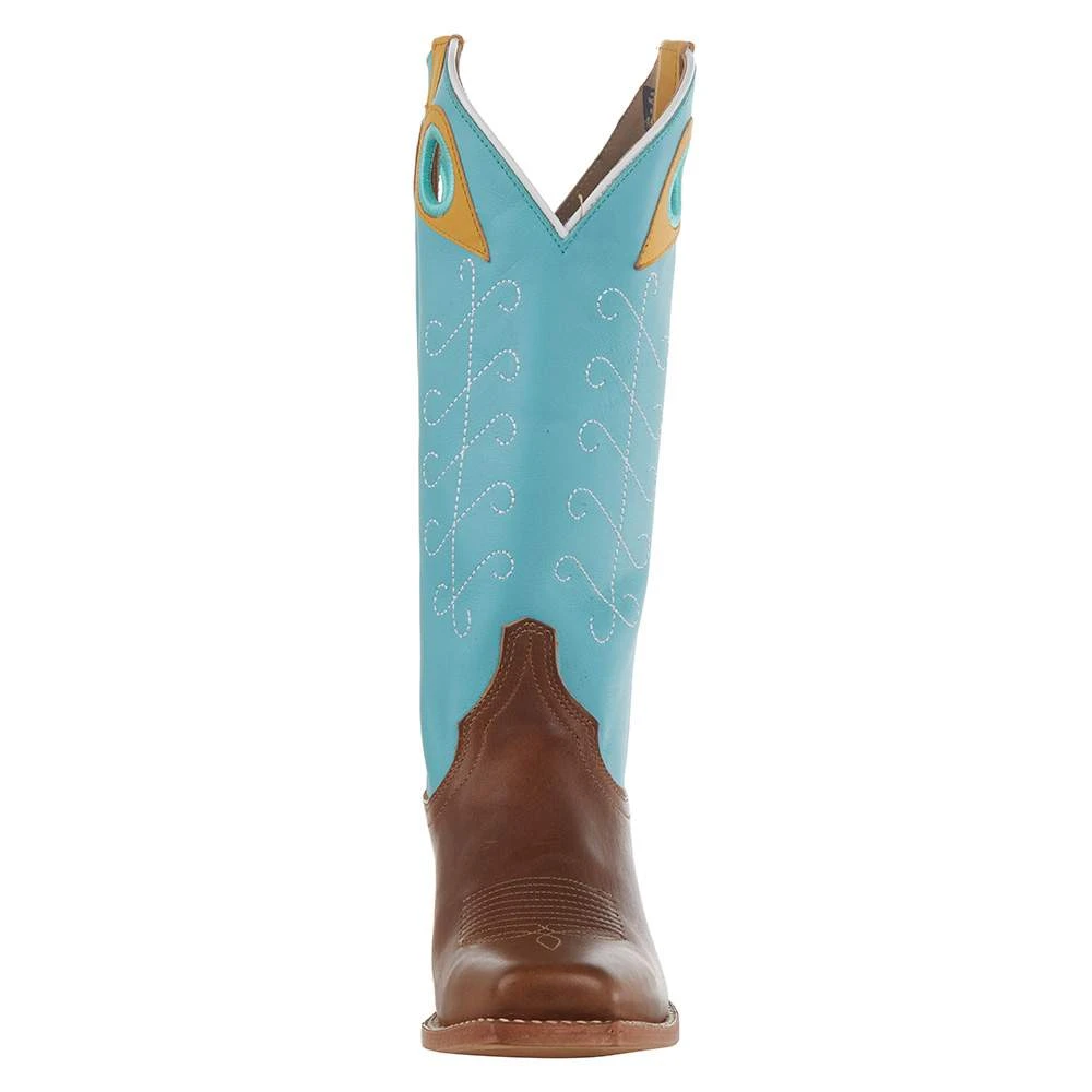 You always get the job done, but you appreciate getting it done with your own stylish flair. Amber pull holes and straps accent the beautiful sky blue cowhide upper to complement the saddle tan cowhide vamp. This vintage-inspired boot is both functional and comfortable. It features a cowgirl underslung heel, a medium square toe, and the J-Flex® Comfort System. Our Punchy collection is crafted of durable leathers that are as tough as the women who put them to the test every day.