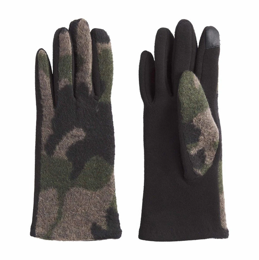 Fuzzy camo gloves feature ponte knit palms with touchscreen technology forefingers and thumbs.