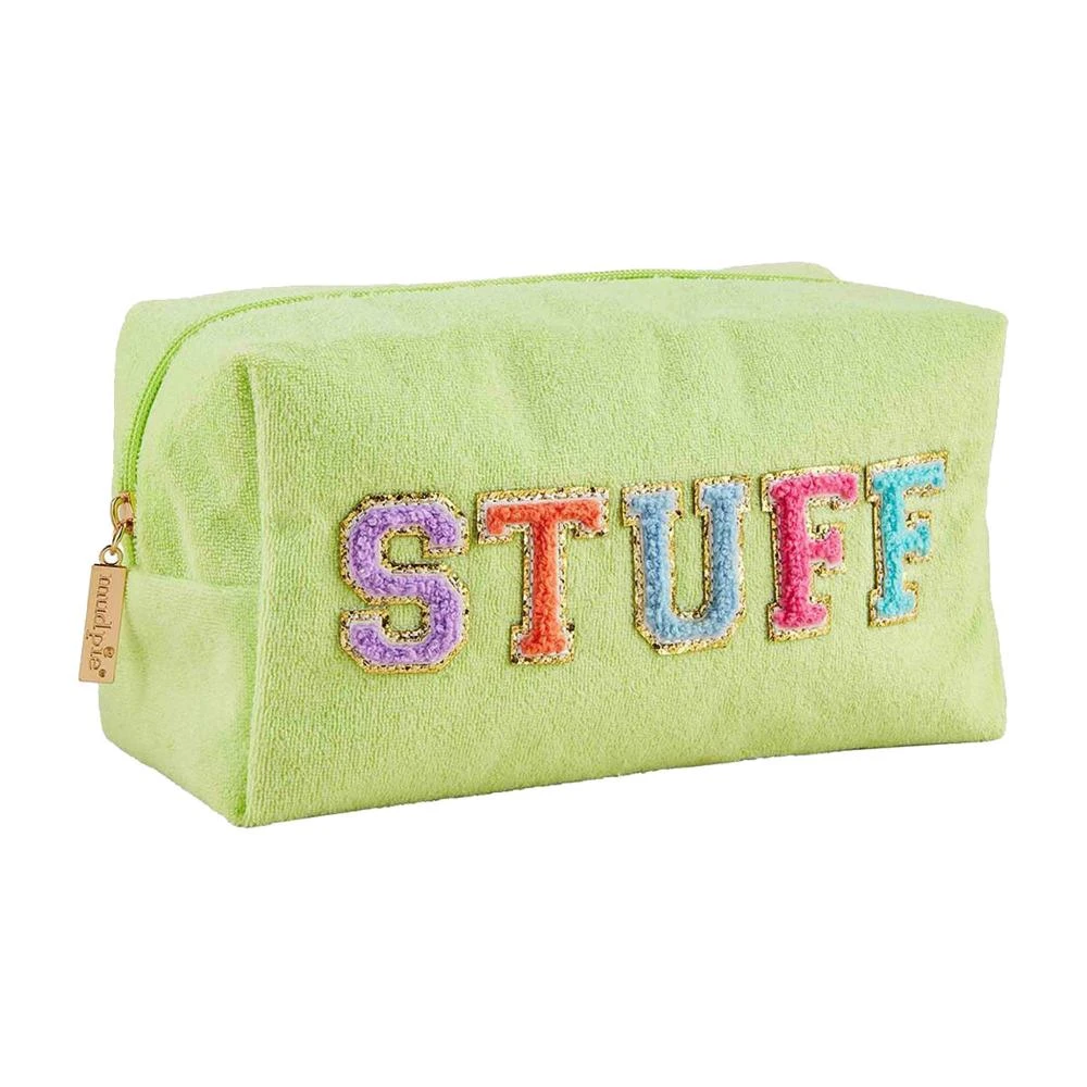 This terrycloth zipper pouch features bright patch lettering and wipe-clean interior.