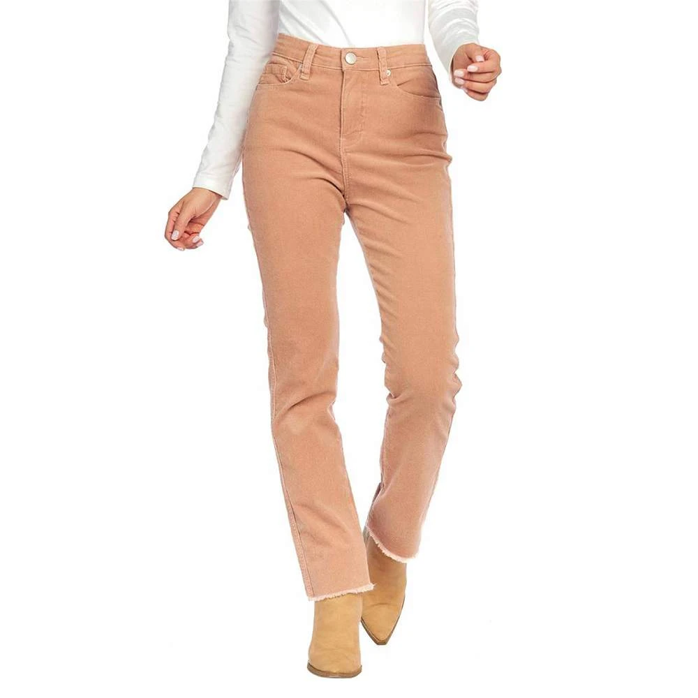 Cotton spandex denim features raw edge hem, high-rise waist with button closure, zipper-fly and front and back pockets