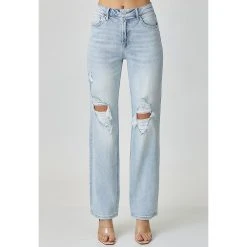 Risen Straight Leg High Rise Jeans! If you LOVE distressed jeans, these are perfect for you! Wear these for any occasion! Risen jeans do have stretch. These run true to size. Machine wash separately in cold water.