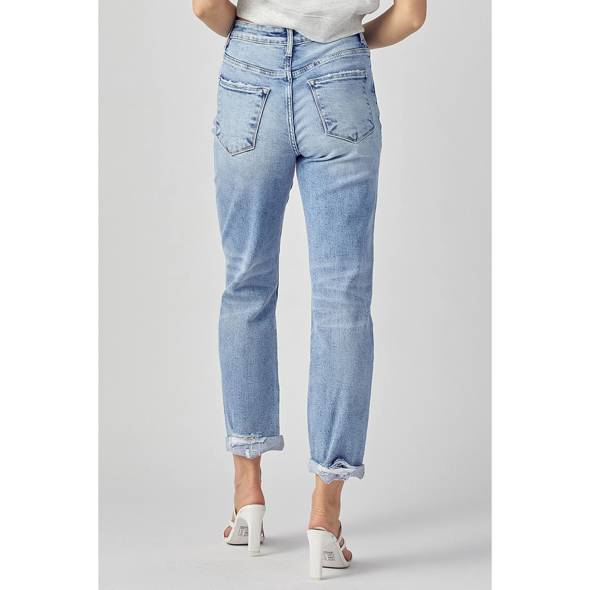The roll up hem detail allows you to adjust the length of the jeans. By folding up the hem of the jeans, the wearer can create a cropped, tapered look that is fashionable and versatile.