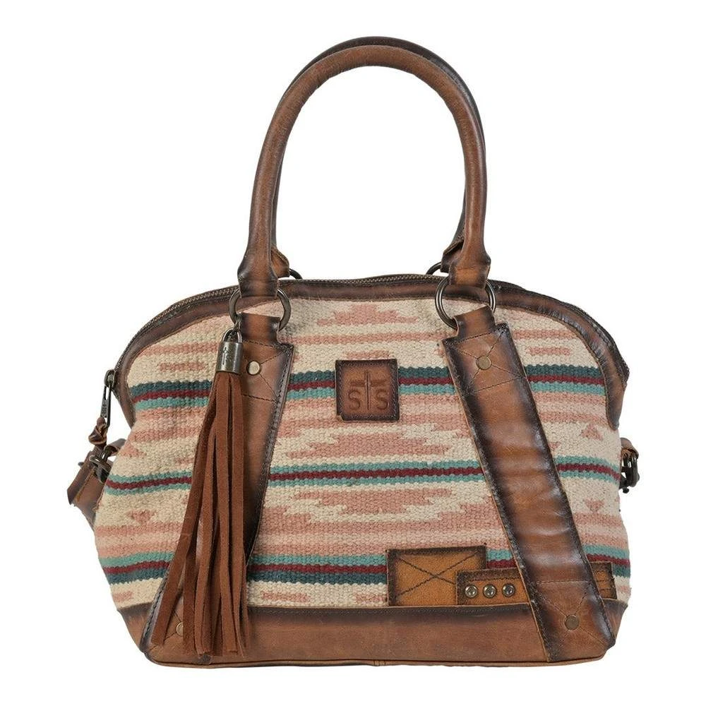 The Palomino Sansa Satchel features Aztec woven serape with genuine leather accents for a touch of Western flair.