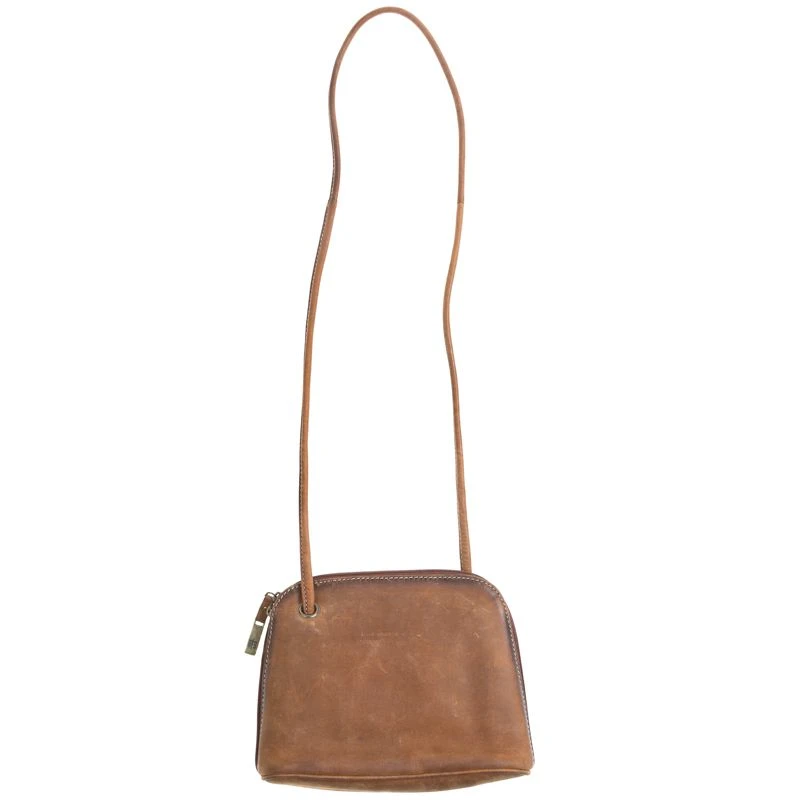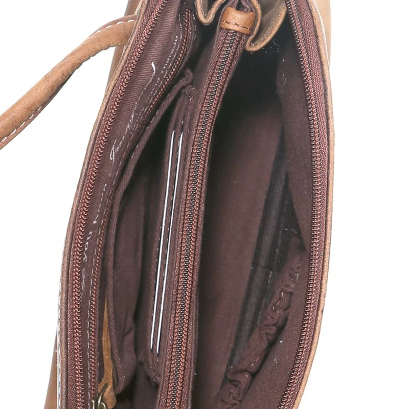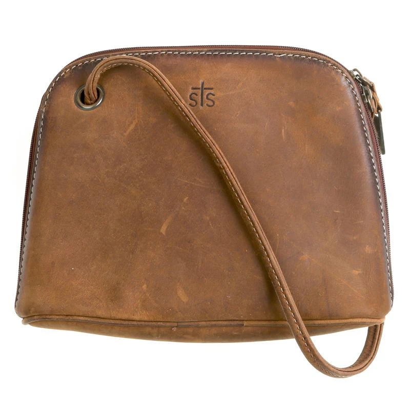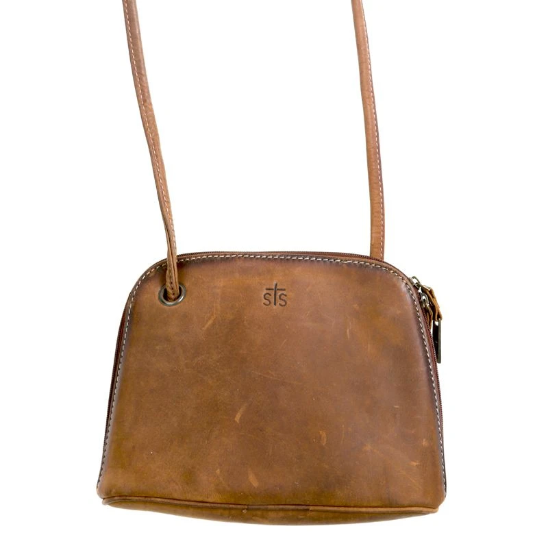 The Baroness Crossbody bag is made from a soft distressed brown leather.  It features a zipper closure, antique oxidized hardware and YKK zipper pulls. Other features include the Signature STS logo embossment, rolled leather shoulder strap, interior zip, wall and cell phone pockets and and inspirational quote on interior lining.