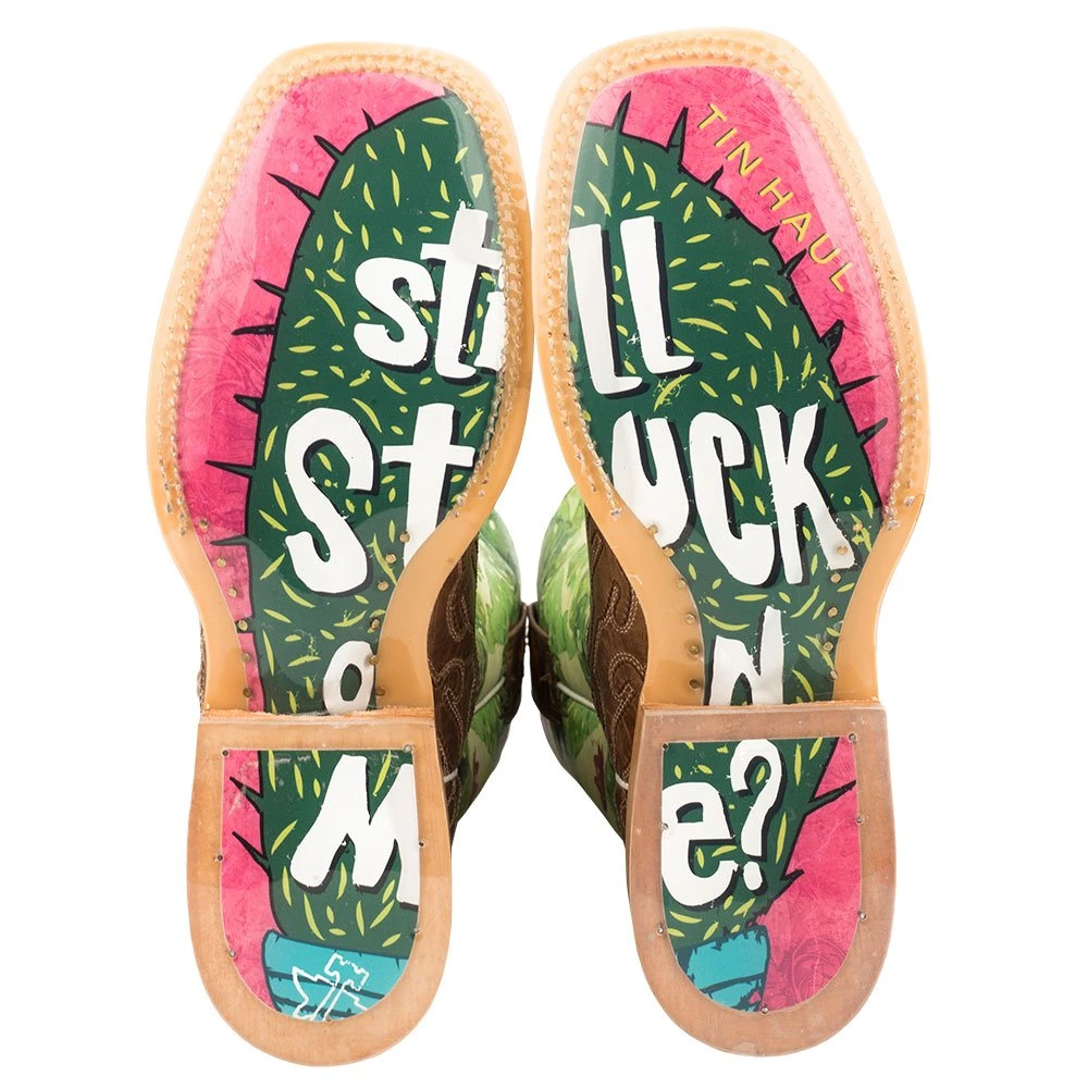 Tin Haul Footwear Ladies Burnished Tan Stitched Cactus Vamp Square Toe Cowgirl Boots